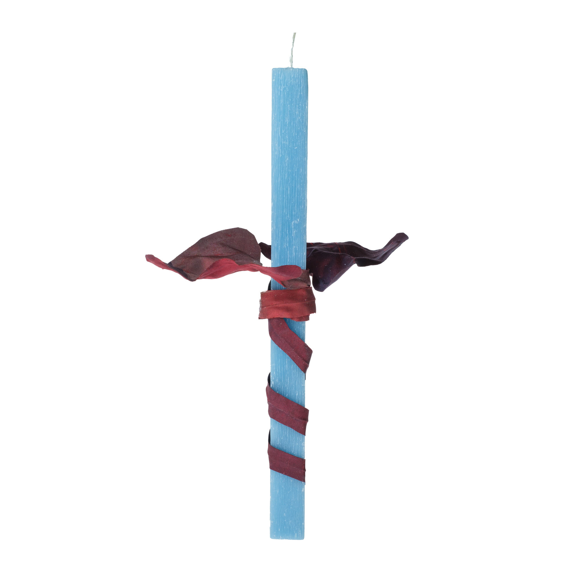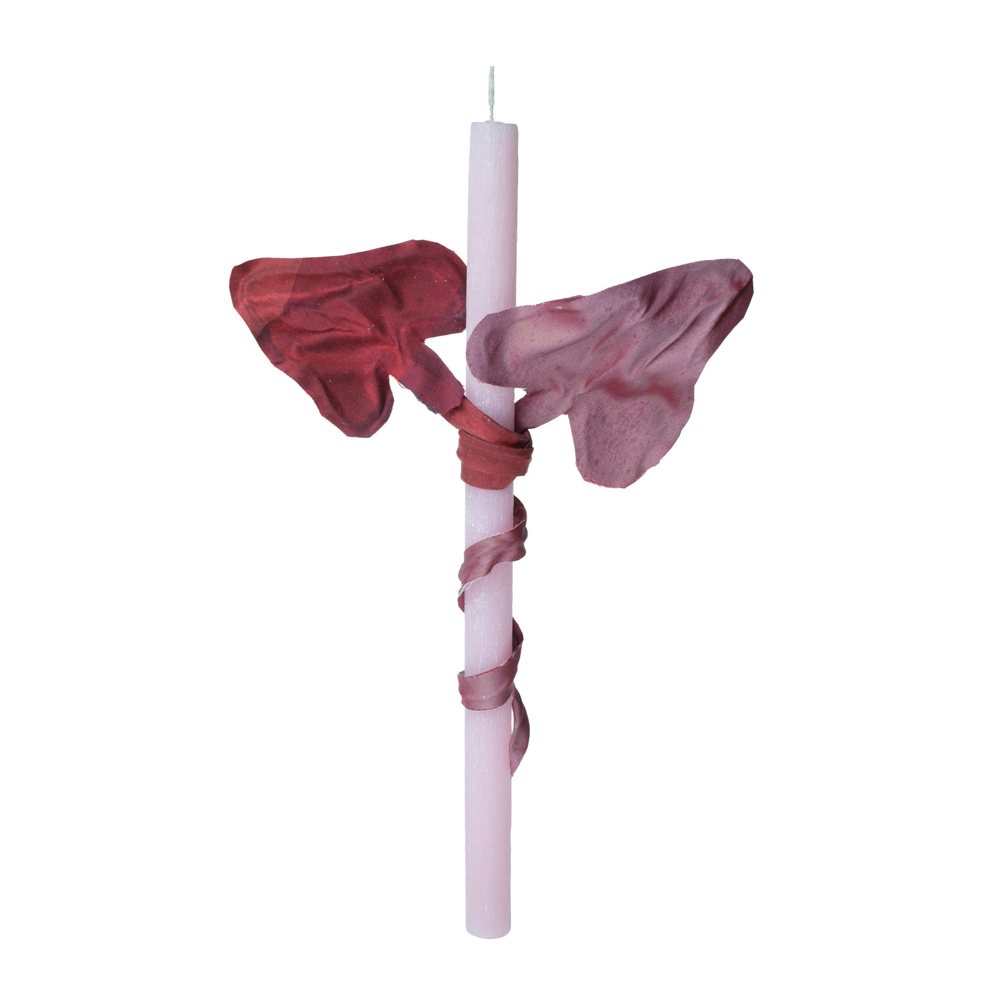 Πασχαλινή λαμπάδα με χειροποίητο διάκοσμο υφασμάτινα φύλλα, από ανακυκλωμένα υλικά, σε διάφορα χρώματα. Δημιουργία των εργαστηρίων του Εθνικού Θεάτρου.