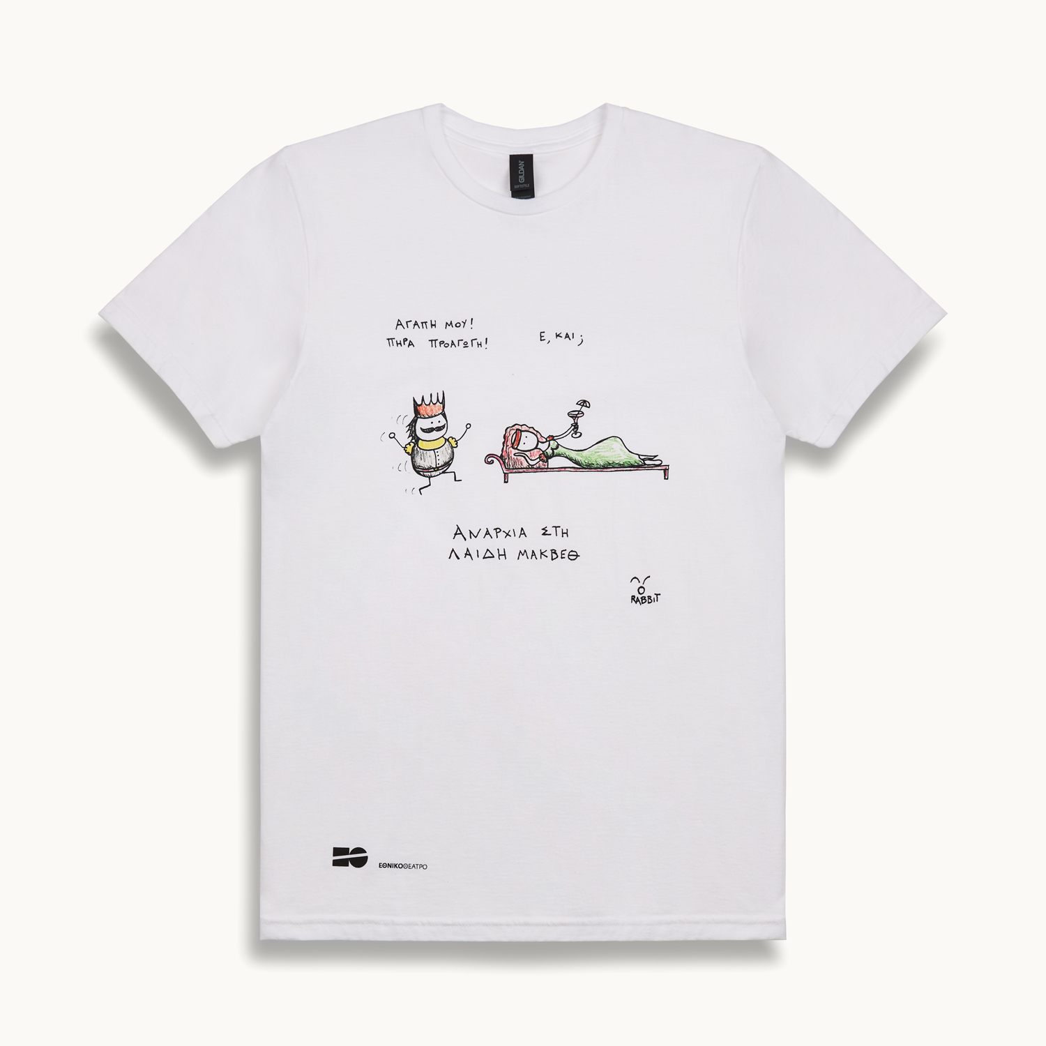 T-shirt κοντομάνικο σε λευκό χρώμα εμπνευσμένο από το έργο Μάκβεθ του Ουίλλιαμ Σαίξπηρ. Η σειρά Αναρχία στον Σαίξπηρ σχεδιάστηκε από τον the rabbit knows.