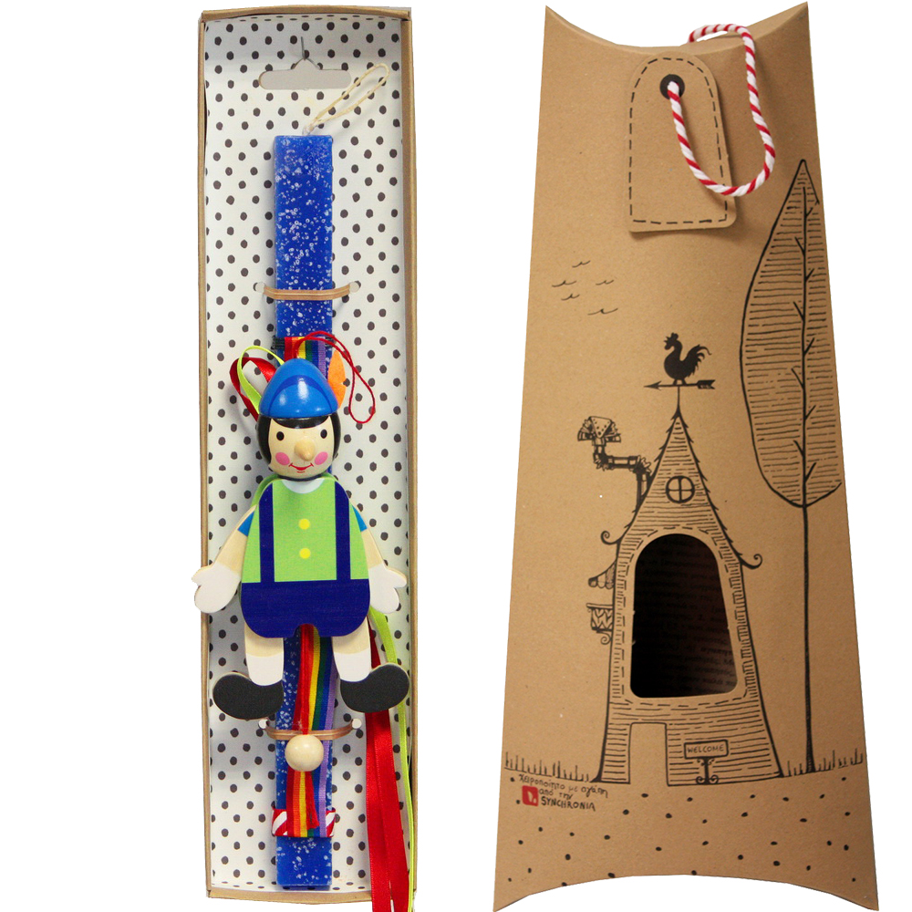 Λαμπάδα από αρωματικό κερί διακοσμημένη με έναν ξύλινο Πινόκιο μαριονέτα.